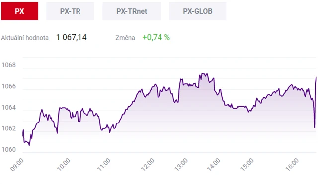 Pražská burza zakončila čtvrteční obchodování v zelených číslech, index PX zpevnil o 0,74 % na 1 067,14 bodu. Nejvyšší zisk zaznamenaly akcie antivirové firmy Avast, které zdražily o 2,5 % na 123 Kč. Nedařilo se naopak mediální skupině CME, jejíž cenné papíry odepsaly 1,62 % na 109 Kč. Objem obchodů byl s 423 miliony korun mírně podprůměrný.