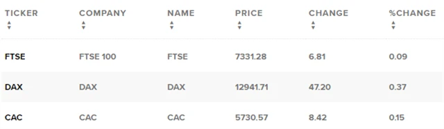 Regionální index STOXX Europe 600 posílil o 0,25 % na 398,99 bodu, britský FTSE 100 zpevnil o 0,09 % na 7 331,28 bodu, francouzský CAC 40 získal 0,15 % na 5 730,57 bodu a německý DAX vzrostl o 0,37 % na 12 941,71 bodu.