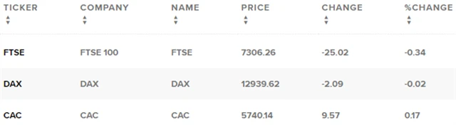 Regionální index STOXX Europe 600 odepsal 0,16 % na 398,37 bodu, britský FTSE 100 přišel o 0,34 % na 7 306,26 bodu, francouzský CAC 40 se zvýšil o 0,17 % na 5 740,14 bodu a německý DAX uzavřel na červené nule (12 939,62 bodu).