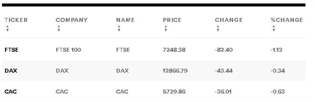 Celoevropský akciový index STOXX Europe 600 během odpoledního obchodování odepsal 0,3 procenta. Hlavní index londýnské burzy FTSE 100 přišel o 1,12 procenta, německý DAX poklesl o 0,34 procenta a francouzský CAC 40 si pohoršil o 0,63 procenta.