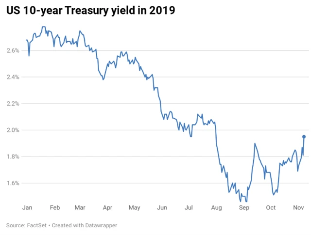 "Vzhledem k tomu, že dnes nebyla zveřejněna žádná ekonomická data, se jedná spíše o reakci na pozitivní zprávy týkající se obchodní války mezi USA a Čínou," okomentoval dění na dluhopisovém trhu Benjamin Jeffery z BMO Capital Markets.