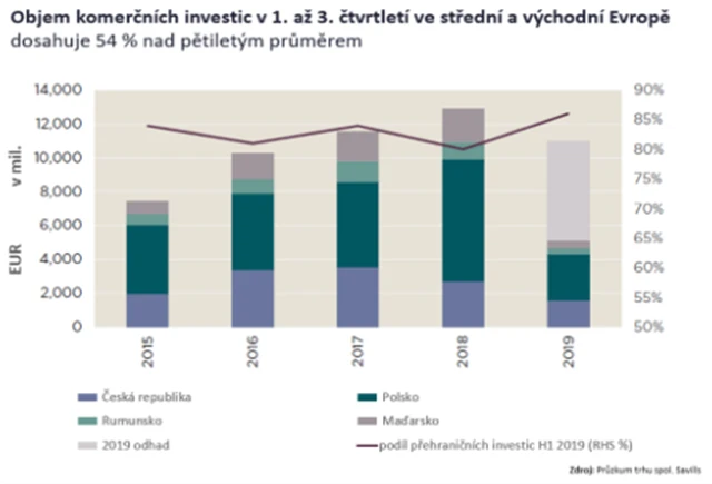 Kanceláře v prvním a třetím čtvrtletí představovaly více než 60 % objemu investic ve střední a východní Evropě, což byl výrazný nárůst ze 45 % ve stejném období v roce 2018. Investice do retailového sektoru zaznamenaly pokles podílu na 16 % z 38 % v loňském roce, zatímco podíl investic do průmyslových aktiv zůstal stabilní na úrovni 13 %. Podíl transakcí v hotelovém sektoru, zejména v Praze a Budapešti, v prvním až třetím čtvrtletí se zvýšil na 9 % z 3 % v loňském roce.
