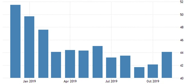 Německý výrobní sektor se v listopadu stále nacházel hluboko v pásmu kontrakce, dařilo se mu však více než v říjnu. PMI ve zpracovatelském sektoru se zvýšil na 44,1 bodu z 42,1 bodu v předchozím měsíci. Trh vyhlížel růst na 43,8 bodu.