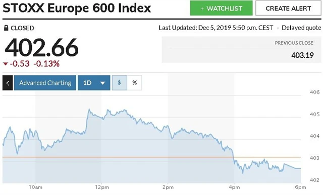 Celoevropský index STOXX Europe 600 zakončil obchodování se ztrátou 0,13 %. Hlavní index londýnské burzy FTSE 100 odepsal 0,70 % a německý DAX poklesl o 0,65 %. Pouze francouzský index CAC 40 uzavřel na zelené nule se ziskem 0,03 %.