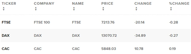 Regionální index STOXX Europe 600 odevzdal 0,26 % na 405,34 bodu, britský FTSE 100 přišel o 0,28 % na 7 213,76 bodu, francouzský CAC 40 zpevnil o 0,19 % na 5 848,03 bodu a německý DAX ztratil 0,27 % na 13 070,72 bodu. Nejvíce klesl telekomunikační sektor, který si pohoršil zhruba o 0,7 %.