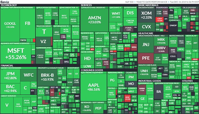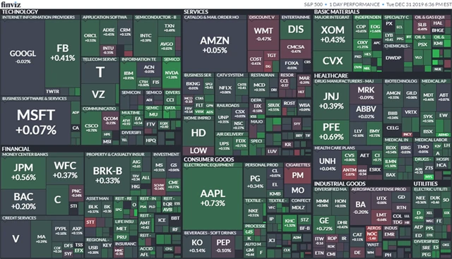 Za celý rok si Dow připsal 22,33 %, S&P 500 vzrostl o 28,9 % a Nasdaq Composite o 35,24 %. K letošnímu růstu indexů přispěla zpráva o pokroku v obchodním jednání mezi USA a Čínou koncem roku, ale také vývoj měnové politiky a zlepšení výhledu růstu ekonomiky.