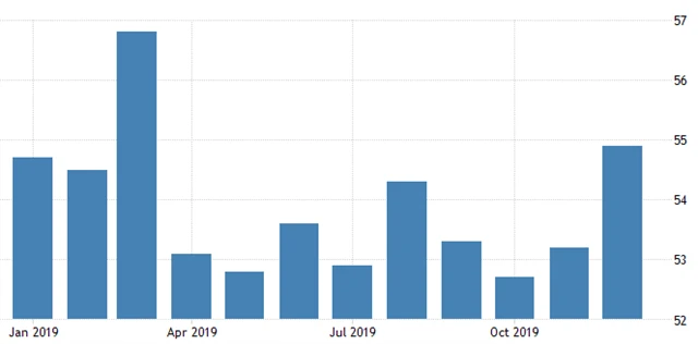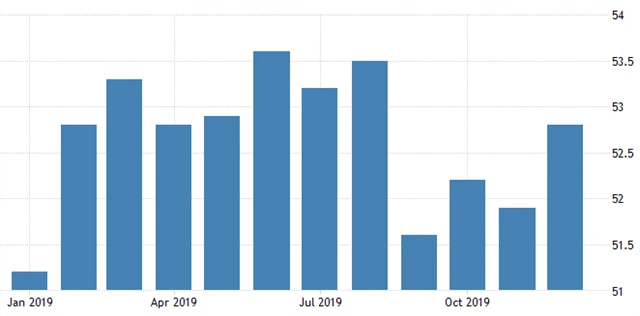 Prosincové indexy nákupních manažerů v sektoru služeb ukazují, jak na tom bude evropská ekonomika podle manažerů firem ve výhledu příštích šesti měsíců. (6. 1. 2020)
