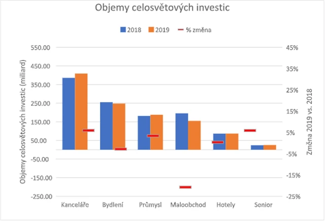 V roce 2019 objemy celosvětových investic do nemovitostí podle analýzy mírně poklesly. Tento pokles podle Sophie Chickové, vedoucí Savills World Research, nebyl důsledkem nedostatku kapitálu, ale spíše nedostatku aktiv na trhu. K největšímu nárůstu objemu došlo u kanceláří a bydlení pro seniory, a to o 6 %. Průmyslový sektor zaznamenal mírnější růst o 3