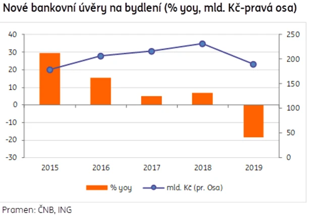 Objem nových úvěrů na bydlení v Česku byl loni o 18,3 % nižší než v roce 2018. Za výrazným poklesem stojí přísnějších doporučení ČNB, efekt předzásobení v roce 2018, ale také rychlý růst cen nemovitostí, který již odrazuje některé domácnosti od koupě vlastní nemovitosti, uvádí hlavní analytik ING Jakub Seidler, který vychází z úvěrové zprávy České národní banky, jež byla v pátek zveřejněna.