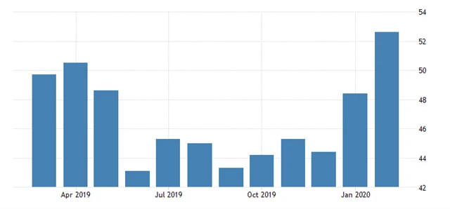 Index britských nákupních manažerů ve stavebnictví dosáhl v únoru hodnoty 52,6 bodu. Poté, co v lednu dosáhl 48,4 bodu, trh očekával mírné navýšení indexu na 48,8 bodu.