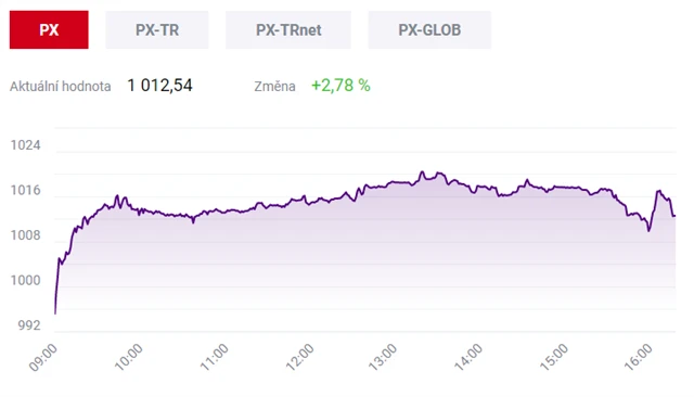 Pražská burza v úterý výrazně posílila, pokračovala tak v růstu nastartovaném v pondělí po předchozí sérii sedmi propadů. Index PX se vrátil nad 1 000 bodů, vzrostl o 2,78 % na 1 012,54 bodu. Dařilo se většině akcií, přes pět procent posílily elektrárenská společnost ČEZ, MONETA Money Bank a nápojářská skupina Kofola. Naopak se ztrátou zakončily dnešní obchodování Erste Group Bank a mediální společnost CME.