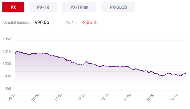 Pražská burza se ve čtvrtek po dalším oslabení znovu propadla pod hranici 1 000 bodů. Index PX klesl o 2,06 % na 990,66 bodu. Nejvýrazněji ztrácely akcie bankovní skupiny Erste, které zlevnily o více než čtyři procenta. Dostaly se tím na nejnižší cenu od listopadu 2016.