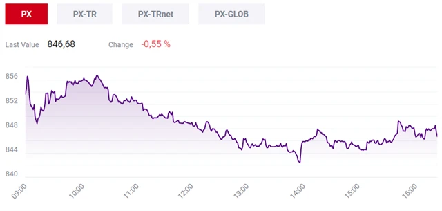 Pražská burza zahájila týden poklesem. Index PX oslabil o 0,55 % na 846,68 bodu. Dolů ho táhly hlavně akcie společnosti ČEZ a Komerční banky. Naopak dařilo se rakouským finančním titulům a Avastu.