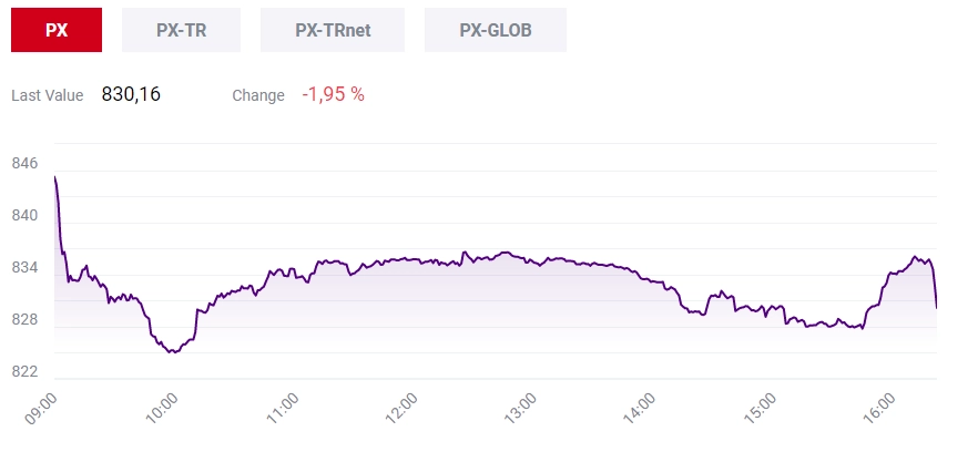 Pražská burza v úterý prohloubila své ztráty z pondělka. Index PX oslabil o 1,95 % na 830,16 bodu. Dolů ho táhly hlavně bankovní tituly v čele s Erste. Výraznějšímu poklesu indexu zabránily cenné papíry operátora O2 a pojišťovny VIG.