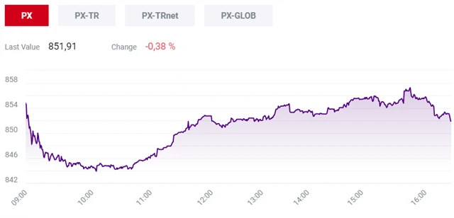 Pražská burza v pátek oslabila, index PX klesl o 0,38 % na 851,91 bodu. Za celý týden pak skončila na zelené nule, když přidala podle PX 0,06 %. K pátečnímu oslabení přispěly hlavně akcie energetické firmy ČEZ a části bank.