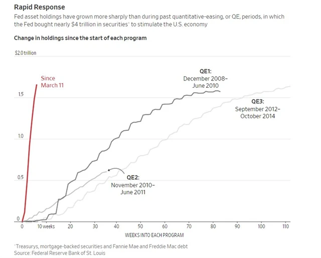 Fed potřeboval téměř 80 týdnů, aby nakoupil během minulé finanční krize to, co nyní nakoupil od 11. března, tedy za méně než 10 týdnů. Federální rezervní systém tak přifoukl svou bilance o více než 1,5 bilionu dolarů.