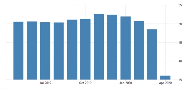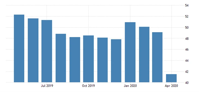 Podle předběžné zprávy z konce dubna klesl index z březnových 48,5 bodu na hodnotu 36,9 bodu a tato hodnota byla očekávána i ve finální zprávě. Výroba, nové objednávky a export zaznamenaly rekordní propad kvůli opatřením zavedeným k potlačení pandemie covid-19. Zároveň došlo k největšímu propadu zaměstnanosti od března 2009