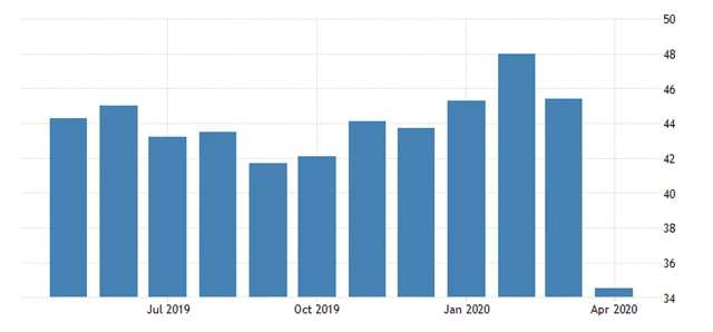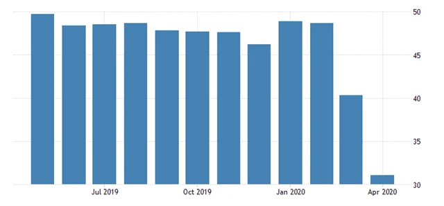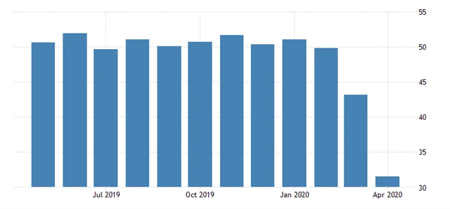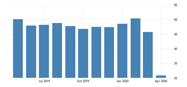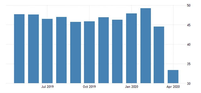 Index podnikatelské aktivity ve zpracovatelském sektoru se v dubnu propadl na 33,4 bodu z březnových 44,5 bodu. Dostal se tak nejníže od poloviny roku 1997, kdy IHS Markit s těmito průzkumy začala. Nachází se tak hluboko pod klíčovou padesátibodovou hranicí, která je předělem mezi růstem a poklesem aktivity. Index PMI tak zaznamenal ještě větší propad, než signalizovaly předběžné údaje z konce dubna.