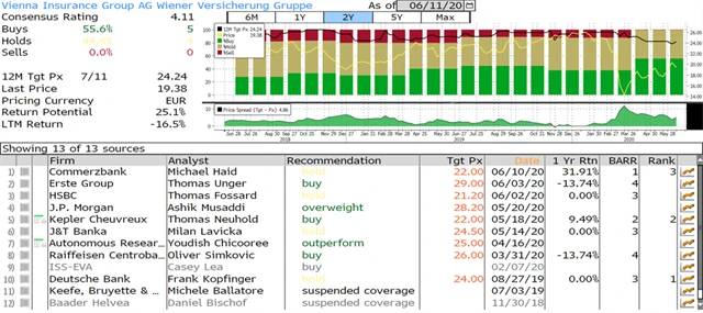 Analytik Commerzbank Michael Haid tento týden zvýšil cílovou cenu akcií Vienna Insurance Group na 22 eur (v přepočtu 584 Kč) z 19 eur. Doporučení Haid ponechal na stupni "držet".
