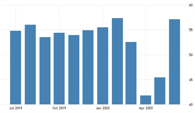 Index zaměstnanosti se zvýšil na 43,1 bodu z 31,8 bodu. Index se sice zvyšuje z dubnových 30 bodů, což byla nejnižší hodnota od roku 1997, je ale částečně v rozporu se zprávou o zaměstnanosti. Ta ukázala, že v červnu vzniklo rekordních 4,8 milionu pracovních míst, z toho 4,26 milionu v sektoru služeb.