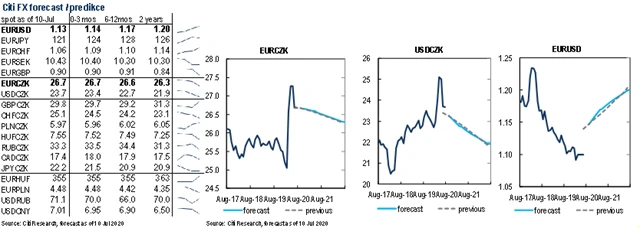 Koruna zůstává relativně stabilní navzdory slabší výkonnosti regionálních měn, kdy příznivější rizikový sentiment zřejmě kompenzoval vyšší počty covidových nákaz, které se koncentrovaly v jednom regionu. Česká měna by tak měla zůstat beze změny v návaznosti na ekonomické oživení doprovázené pokračující uvolněnou měnovou politiku, píše v novém výhledu Citibank. Nečekáme, že by ČNB využila nějaké nestandardní opatření, pokud si to nevyžádá druhá vlna covidu. Ta představuje riziko směrem k vyššímu výhledu pro EUR/CZK, zatímco ČNB odmítající nulové úrokové sazby nebo tierový systém negativní sazby představuje riziko silnější koruny, pokud ECB dále uvolní svou měnovou politiku později v tomto roce, pokračuje Citibank.