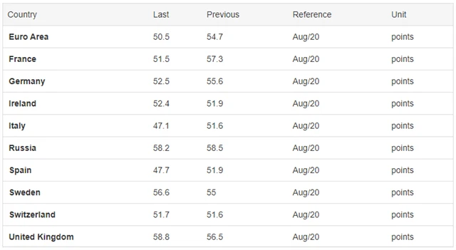 Evropa - PMI v sektoru služeb (srpen 2020), zdroj: tradingeconomics.com