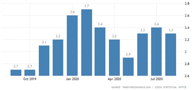 "Kurz koruny nemá důvod na zveřejněná data reagovat a zůstává poblíž úrovně 26,50 EUR/CZK, což je úroveň, se kterou počítáme i pro čtvrté čtvrtletí letošního roku," uvedl analytik Komerční banky Michal Brožka. Očekává, že inflace bude v dalších měsících brzdit a za celý rok skončí v průměru mírně nad třemi procenty. V příštím roce nadále vidí riziko podstřelení inflačního cíle ČNB z důvodu oslabené domácí poptávky.