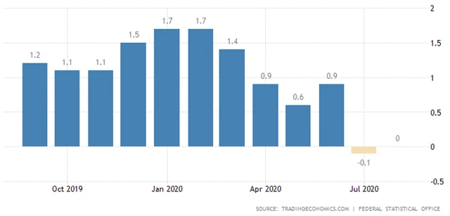 Spotřebitelské ceny v Německu podle finálních údajů v srpnu meziročně stagnovaly. Přestože je to po červencovém poklesu cen o 0,1 % zlepšení, inflace nesplnila očekávání analytiků, kteří očekávali růst cen o 0,1 %. Meziměsíčně se ceny v červenci snížily o 0,1 %, což je po červencovém poklesu o 0,5 % zlepšení a je to také lepší údaj, než očekávali analytici (-0,2 %). Finální zpráva zveřejněná v pátek tak potvrdila předběžné údaje z konce srpna.