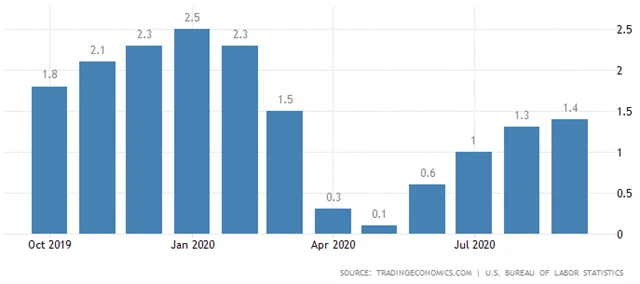 Spotřebitelské ceny ve Spojených státech se v září meziročně zvýšily o 1,4 %. Jejich růst tak zrychlil z 1,3 % v srpnu a dosáhl nejvyšší úrovně za půl roku. Oznámilo to v úterý americké ministerstvo práce. V meziměsíčním srovnání pak ceny vzrostly o 0,2 %. Údaje o inflaci jsou v souladu s odhady analytiků.