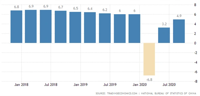 Meziroční růst hrubého domácího produktu Číny ve třetím čtvrtletí zrychlil na 4,9 % z 3,2 % ve druhém čtvrtletí. Oznámil to v pondělí čínský statistický úřad. Ekonomika se tak dál zotavuje z útlumu způsobeného šířením koronaviru. Hospodářský růst však zaostal za očekáváním analytiků, kteří jej v anketě agentury Reuters odhadovali na 5,2 %.