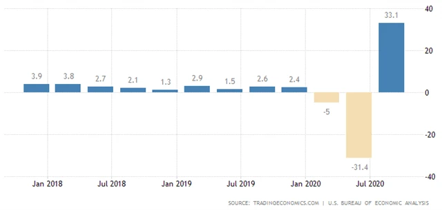 Tempo růstu HDP bylo v uplynulém čtvrtletí nejvyšší minimálně od roku 1947, kdy vláda začala tyto údaje sledovat. Ve druhém čtvrtletí ekonomika naopak kvůli dopadům šíření koronaviru klesla rekordním tempem 31,4 %.