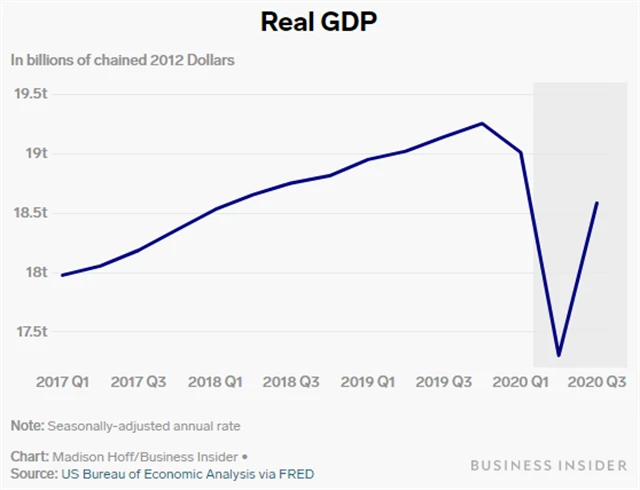 Ekonomika Spojených států ve třetím čtvrtletí podle prvního odhadu vykázala rekordní vzestup. Přispěla k němu vládní pomoc v objemu více než tří bilionů dolarů. Ta podpořila zejména výdaje spotřebitelů. Hrubý domácí produkt USA se v přepočtu na celý rok zvýšil o 33,1 %, oznámilo ve čtvrtek americké ministerstvo obchodu.