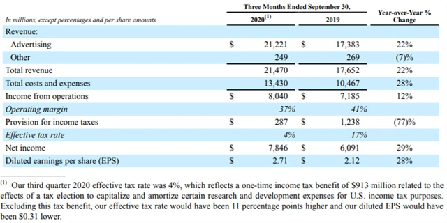 Celkové tržby společnosti, které z valné většiny tvoří právě příjmy z reklamy, se ve třetím čtvrtletí zvýšily na 21,47 miliardy dolarů ze 17,65 miliardy před rokem. Analytici je podle agentury Reuters odhadovali pouze na 19,82 miliardy dolarů.
