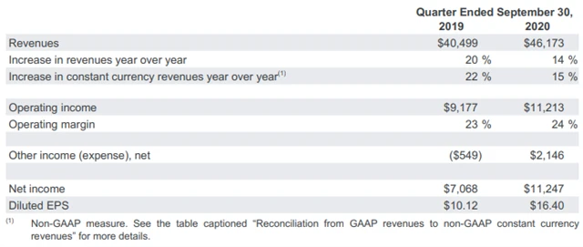 Čistý zisk Alphabetu meziročně stoupl o téměř 60 % 11,2 miliardy dolarů. Analytici v anketě společnosti Refinitiv odhadovali zisk na 7,7 miliardy USD. Zisk na akcii dosáhl ve třetím čtvrtletí 16,40 USD, loni to bylo ve třetím kvartálu 10,12 USD.