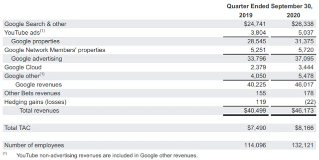Obchod s reklamou v třetím kvartálu představoval 80 % tržeb Alphabetu. Vyhledávač Google i portál YouTube se v době pandemie těší velké oblibě vlivem karanténních opatření a zavírání obchodů a služeb.