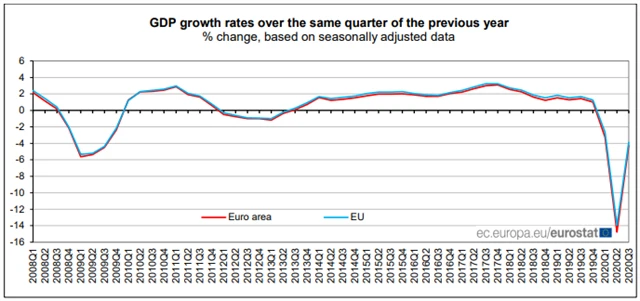 V meziročním srovnání hospodářství dále klesá, i když tempo propadu se výrazně snížilo. V EU dosáhl meziroční pokles 3,9 % po propadu o 13,9 % v období od dubna do června. V eurozóně tempo poklesu kleslo na 4,3 % ze 14,8 %.