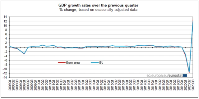 Ekonomika Evropské unie se ve třetím čtvrtletí částečně zotavila z koronavirového propadu, hrubý domácí produkt se ve srovnání s předchozím čtvrtletím zvýšil o 12,1 %. V prvním rychlém odhadu to v pátek oznámil evropský statistický úřad Eurostat. Podobně v zemích eurozóny ekonomika vzrostla o 12,7 %. Je to nejvýraznější vzestup od roku 1995, kdy se tento údaj začal sledovat. Ve druhém čtvrtletí se ekonomika EU propadla kvůli koronaviru o 11,4 %. V eurozóně se HDP ve druhém čtvrtletí snížil o 11,8 %.