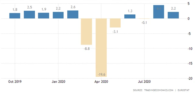 Tržby maloobchodních prodejců v eurozóně v září vzrostly meziročně o 2,2 %. Čekal se 2,8 růst po jejich zvýšení o 4,4 % v srpnu (revidováno z +3,7 %). Meziměsíčně se tržby o dvě procenta snížily, čekal se procentní pokles po 4,2% zvýšení v srpnu (revidováno z +4,4 %).