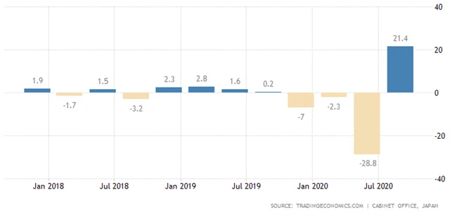Japonská ekonomika se vymanila z recese způsobené koronavirovou krizí. Ve třetím čtvrtletí přidala v přepočtu na celý rok 21,4 %, což je nejvíce od roku 1980, kdy se údaj začal zveřejňovat, a více, než se čekalo. Vyplývá to z předběžné zprávy, kterou v pondělí zveřejnila japonská vláda. Zotavil se vývoz i spotřeba.
