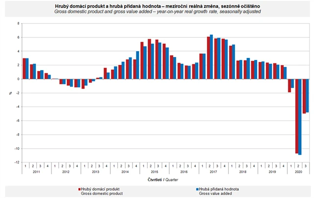 Česká ekonomika ve třetím čtvrtletí zmírnila podle zpřesněných údajů Českého statistického úřadu (ČSÚ) meziroční pokles na pět procent. Ve druhém čtvrtletí klesl hrubý domácí produkt kvůli koronaviru o 10,7 %, což byl nejhorší výsledek od vzniku samostatné České republiky. Mezičtvrtletně HDP ve třetím kvartálu vzrostl o 6,9 %.
