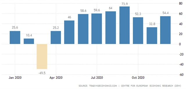 Index ekonomického sentimentu pro celou eurozónu v prosinci vyskočil na 54,4 bodu z 32 bodů v listopadu.