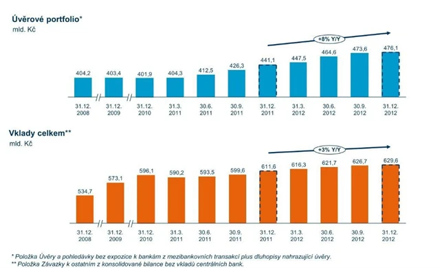 Objem vkladů banky vzrostl v roce 2012 o tři procenta na 630 miliard korun. Objem úvěrů loni vzrostl o osm procent na 476,1 miliardy Kč. "Růst úvěrového portfolia v roce 2012 dokazuje, že i přes útlum hospodářství pokračuje poptávka po úvěrových produktech. Podobný vývoj můžeme očekávat i letos," uvedl generální ředitel ČSOB Pavel Kavánek.