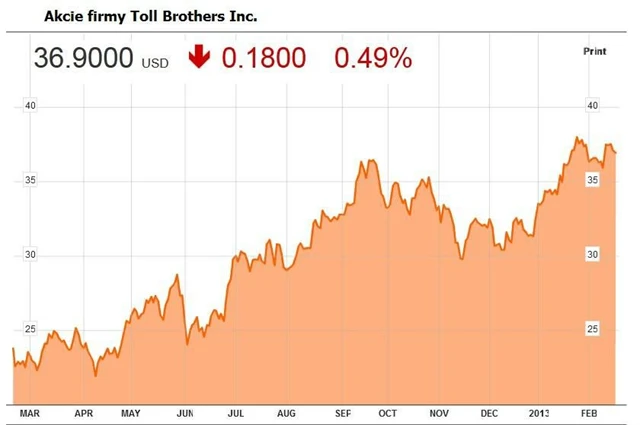 Akcie Toll Brothers za poslední rok zpevnily asi o 55 % a nyní se pohybují kolem 37 USD. Jejich růst tak odráží postupné zlepšení situace na realitním trhu.
