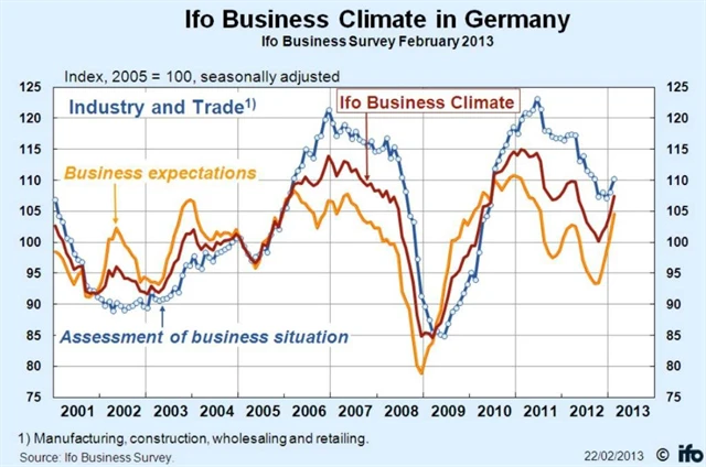 Podnikatelské klima v Německu se během února výrazně zlepšilo. Ukázal to průzkum, který každý měsíc provádí vlivný mnichovský institut Ifo. Jeho index za únor vzrostl na 107,4 bodu, zatímco v lednu byl po zpřesnění dat na 104,3 bodu. Únorový růst je podle institutu nejvýraznější od července 2010.