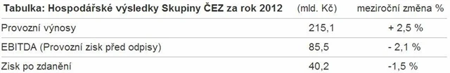 Skupina ČEZ navzdory negativnímu vývoji dokázala dostát odhadům výsledků. Výnosy v roce 2012 meziročně vzrostly o více než 5 miliard Kč na 215,1 miliardy Kč. Provozní zisk před odpisy (EBITDA) se meziročně snížil o 2,1 % (1,8 miliardy Kč) na 85,5 miliardy Kč, ale o 0,5 miliardy překonal očekávání.