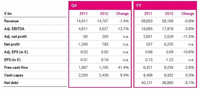 Očištěný zisk před úroky, zdaněním, odpisy a amortizací (EBITDA) klesl ve 4. čtvrtletí 2012 o 13 % na 4,03 miliardy eur. Tržby Deutsche Telekom se za stejné období snížily o 1,4 % na 14,7 miliardy eur. Analytici očekávali v konsenzu zisk 4,16 miliardy eur a tržby 14,6 miliardy eur.