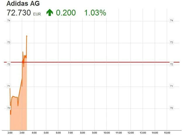 Akcie Adidasu v 9:02 na Frankfurtské burze vzrostly o 0,6 % na 72,11 eur po původním pádu na 71 eur.
