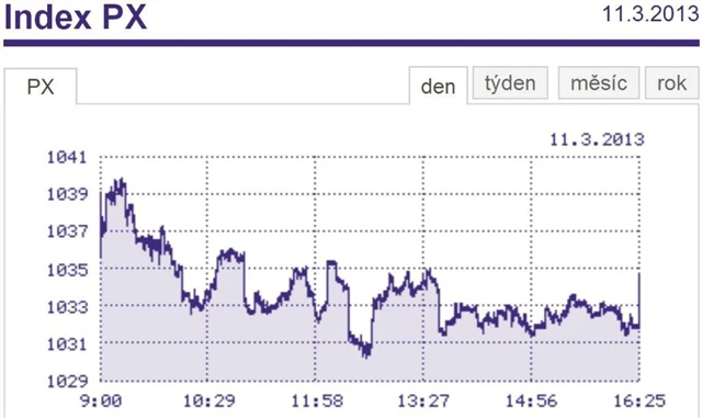 Pražská burza se dnes propadla, tratily hlavně největší emise. Index PX odepsal 0,43 procenta na 1 034,45 bodu.