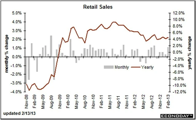 Ekonomové předpokládali, že budou únorové maloobchodní tržby v USA nejvíce ovlivněny zvýšením daní, rostoucí cenou benzínu, zpožděním daňových refundací a očekávanými škrty v rozpočtu (sekvestrací). Úlevy na daních z Bushovy éry skončily a ekonomové se stále více obávají dopadů vyšších daní na spotřebu. Ta tvoří stále okolo 70 % amerického HDP.