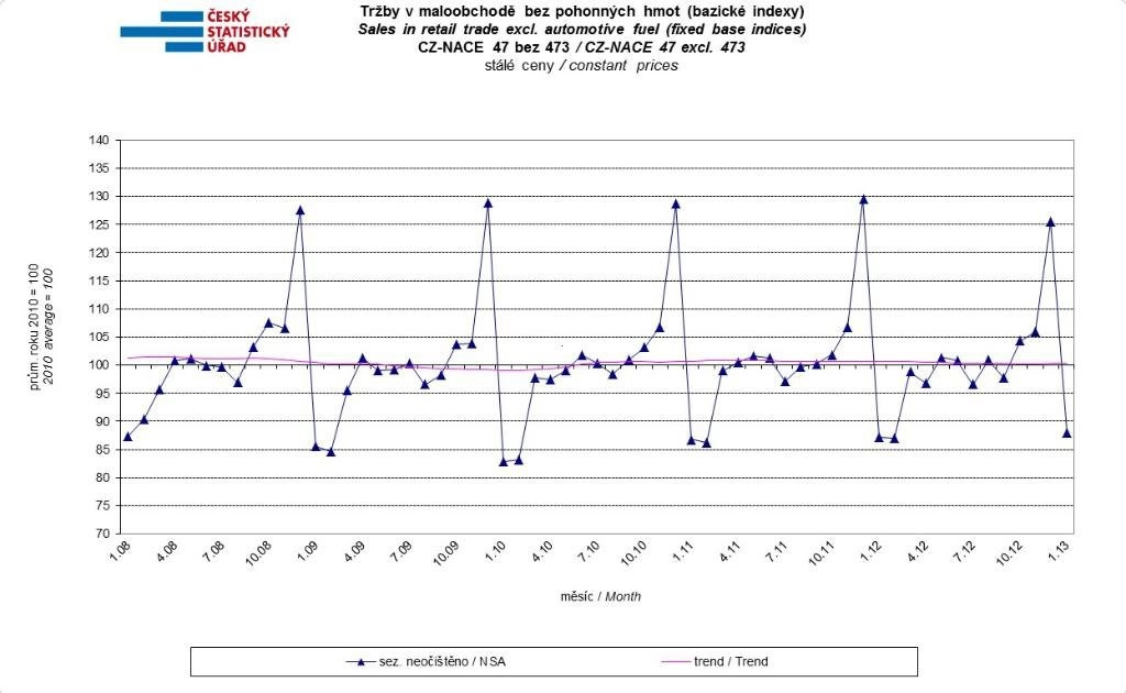 Maloobchodní tržby meziročně očištěné o vliv počtu pracovních dní klesly v lednu o půl procenta a stejný pokles zaznamenaly i bez očištění. V prosinci se přitom snížily o 4,9 % . Lednový výsledek byl ovlivněn nižším prodejem v motoristickém segmentu, naopak ke zmírnění poklesu přispěl růst v maloobchodě.